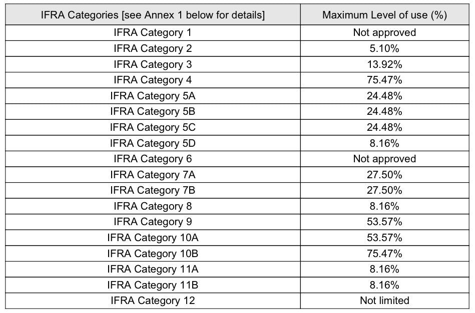 - Follow IFRA usage guidelines below for safe percentages in body and home products.
