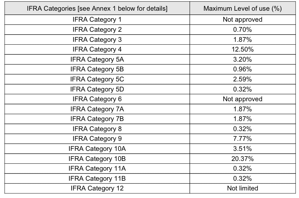 - Follow IFRA usage guidelines below for safe percentages in body and home products.