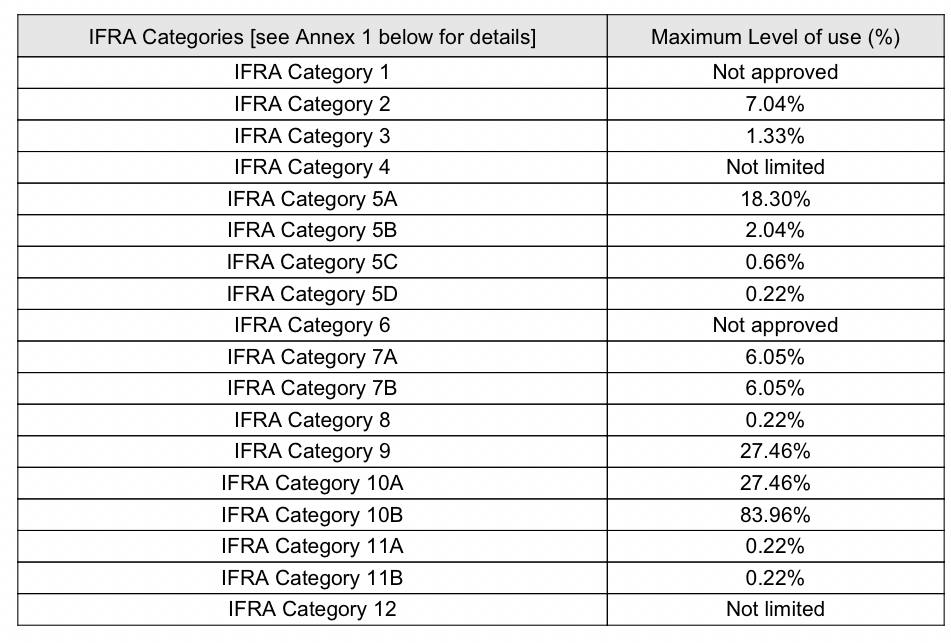 - Follow IFRA usage guidelines below for safe percentages in body and home products.